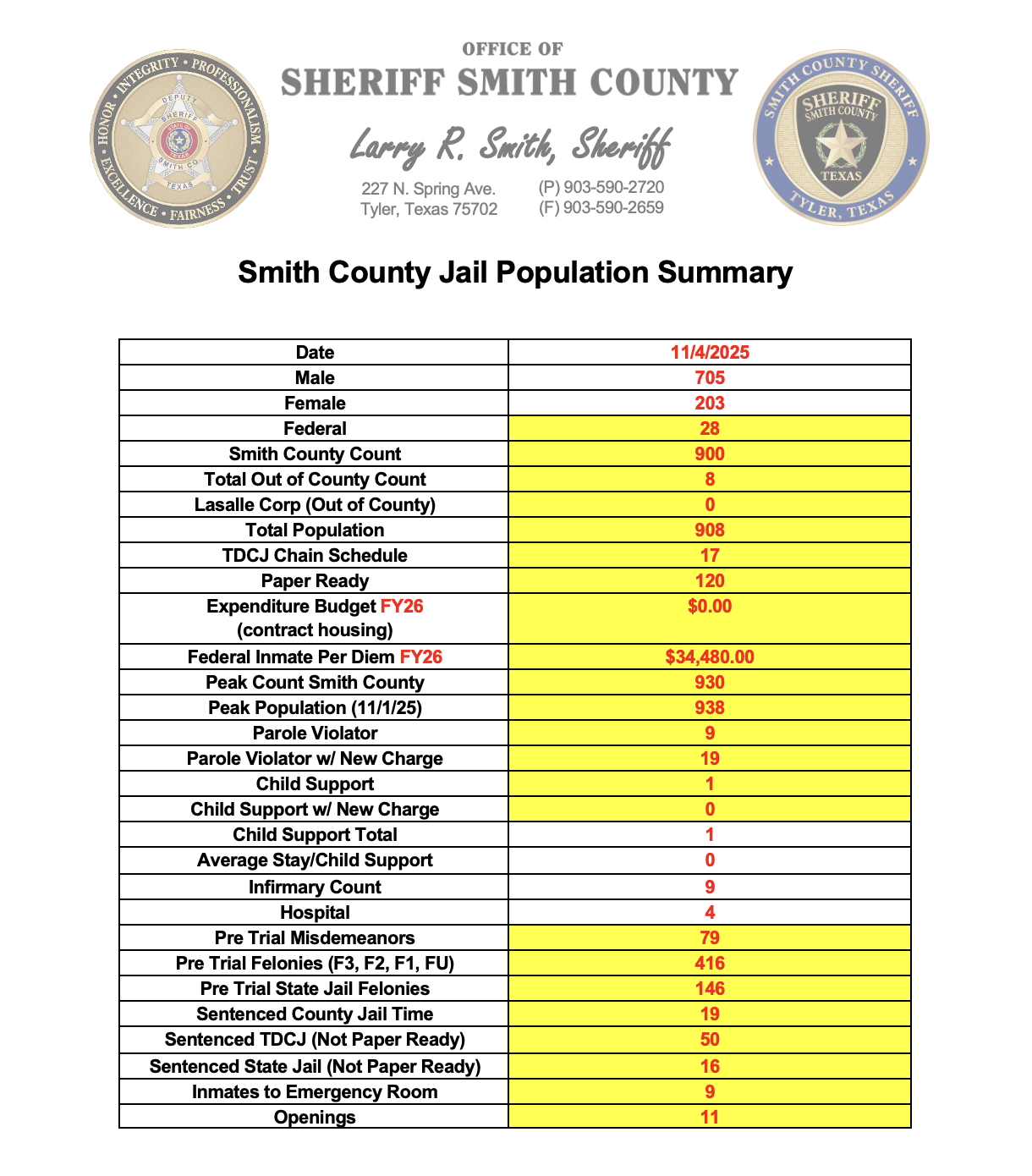 11. Receive report on status of Smith County jail operations, inmate population, employee overtime, and employee vacancies.
