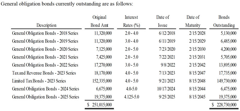 - Debt obligations: $229 million in outstanding voter-approved bonds for major projects. Paid $8.3 million principal in FY25.