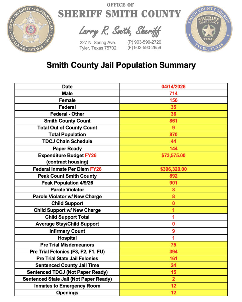 8.  Receive report on status of Smith County jail operations, inmate population, employee overtime, and employee vacancies.