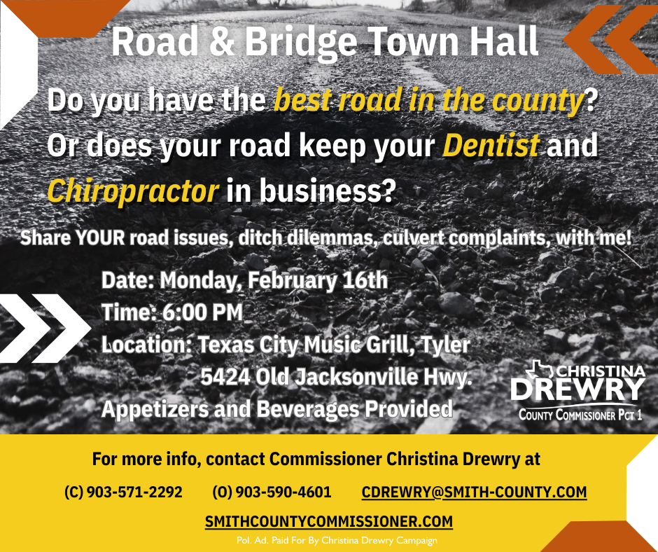 Can’t wait to see you there. Your voice matters, and your concerns will be heard. Let’s make Smith County roads the best they can be—for all of us!