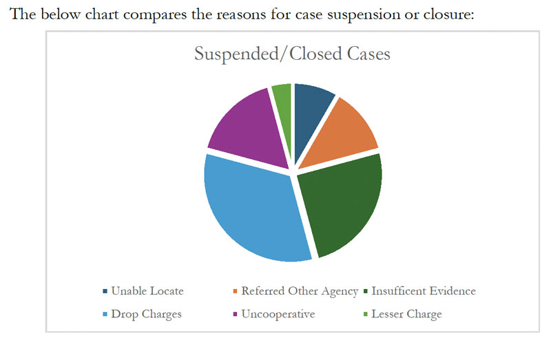 - About half of closed cases stopped because victims chose not to continue or there wasn’t enough evidence to move forward